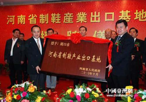 中国台湾网10月29日周口消息 28日上午,河南省副省长史济春代表河南省政府向周口市授予“河南省制鞋产业出口基地”牌匾,这是河南省的首家。它标志着周口市在承接台资制鞋产业转移、打造制鞋产业出口基地取得了明显成效。