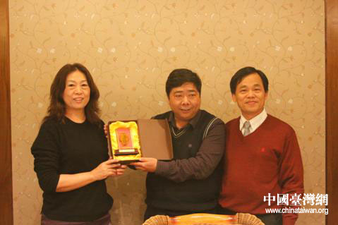 安阳市台办主任李新明向洪丽莉女士、李坤北先生赠送“甲骨片”。图片来源:安阳市台办