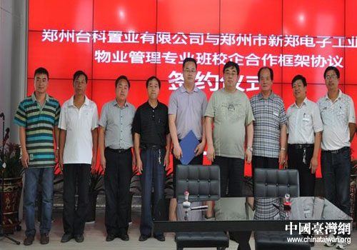 中国台湾网7月2日郑州消息 日前,郑州台湾科技园与新郑电子工业学校在该园区招商中心举行签约仪式,建立校企联合机制。此举旨在通过订单式培养,为园区发展打造一流的物业管理服务团队,为企业提供从进驻到投产运营、再到日常管理和生活的全程、全方位无缝式服务,使入驻企业能够最大化地享受省时、省心、省力、省成本的贴心服务。