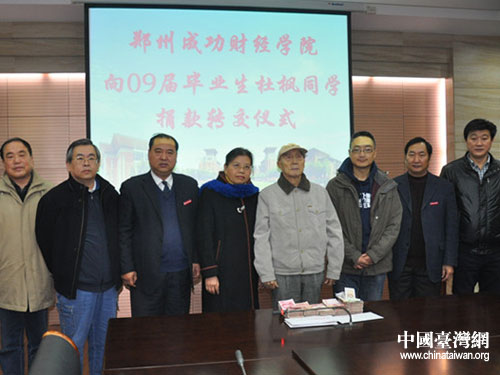 日前,郑州成功学院举行向身患白血病的2005届学子杜枫同学捐款转交仪式。图片来源:郑州市台办
