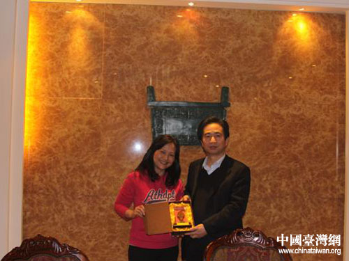 安阳市副市长姜海军向王丽芬女士赠送甲骨文片纪念品。图片来源:安阳台办