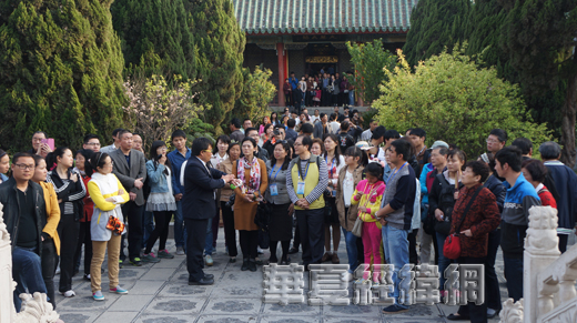 两岸三地的记者听讲解员介绍大相国寺的历史由来和佛教典故。