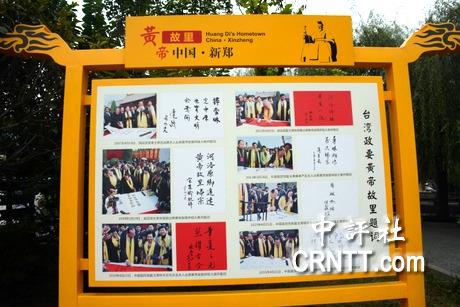 河南新郑黄帝故里有一块大看板,展示台湾政要名拜祖的影像与题字。(中评社 赵家麟摄)