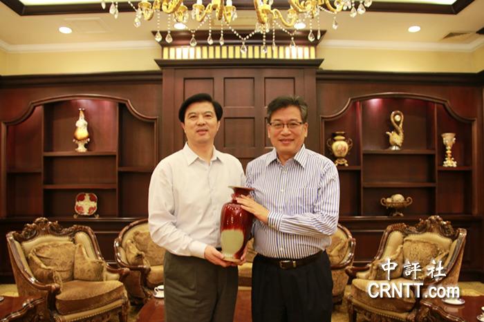 河南省委常委、统战部部长陶明伦部长向中评社常务副社长周建闽赠送礼品(中评社 徐梦溪摄)
