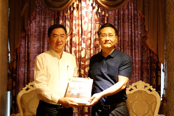 安阳市委统战部副部长李春喜向胡明扬赠送周易文化书籍。(图片来源:安阳市委)