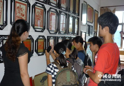 中国台湾网7月29日孝感消息 日前,来自台湾的五名小朋友到湖北孝感市雕花剪纸研究所参观雕花剪纸工艺。台湾小朋友们兴致勃勃的参观了剪纸工艺品展览,对中华民间艺术的博大精深无比赞叹。