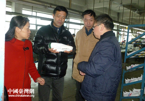 陈推一行在台企宝峰鞋业公司视察。(图片来源:黄石台办)