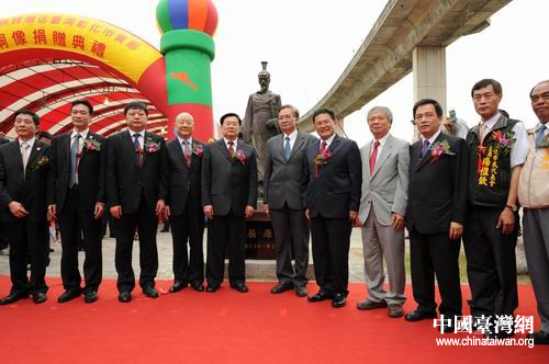 5月10日,屈原铜像落成典礼在彰化举行,两岸嘉宾在铜像前合影。(湖北省台办 陆胜 摄)