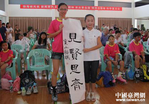 荆门学生桂裕祺(右)将书法作品“见贤思齐”赠送台湾学生高瑭淯(左)。(王启宏 摄)