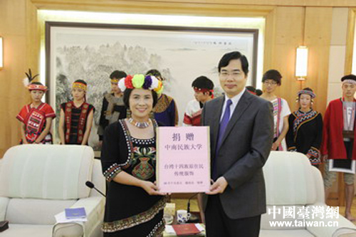 中国台湾网10月25日武汉消息 10月22日上午,在中南民族大学第一接待室,28位身穿台湾少数民族14个族群华丽服饰的青年男女款款而入,吸引了众多媒体争相拍照。这不是服装表演,而是台湾中华海峡两岸少数民族交流协会秘书长戴锦花女士向中南民族大学民族服饰博物馆捐赠台湾少数民族服饰。