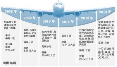 市场风向突变。南航、台湾立荣、华信航空纷纷进入。2010年至2012年3年为“发力期”,华航、复兴、远东3家台湾航空公司蜂拥入汉,开通直飞新航点。目前,武汉—台湾航线每周单边17班,航线可通达台北、台中、花莲、高雄、台南、澎湖等6个城市。武汉直飞台湾航线航班量和密度在中部居首。