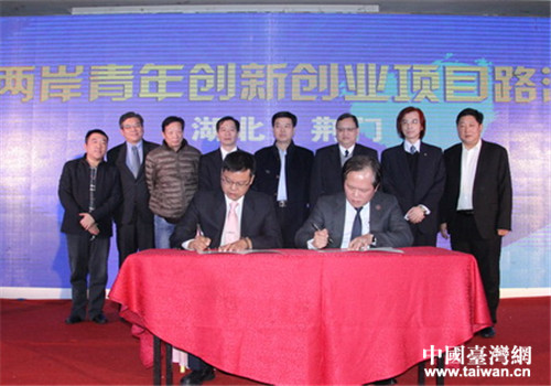 荆门市台协会会长简俊男(右)与台湾精懋科技公司签署合作协议(摄影:王启宏)