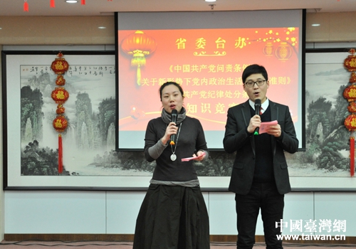 中国台湾网1月25日武汉讯 新年伊始,气象更新,在喜迎新春佳节的日子里,为深入学习贯彻党的十八届六中全会精神,推进机关精神文明建设和文化建设,元月24日下午,省委台办举办了一场寓政治性、知识性、娱乐性于一体别开生面的《关于新形势下党内政治生活若干准则》《中国共产党问责条例》和《中国共产党党内监督条例》知识竞赛暨迎新春职工联欢活动。