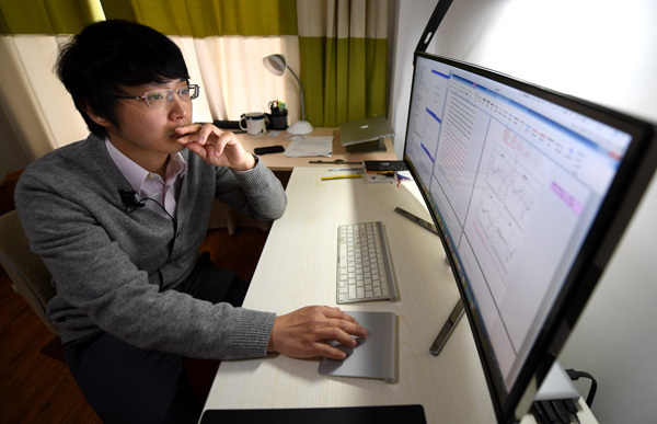 黄志伟在宿舍检索学术资料。新华社记者 程敏 摄
