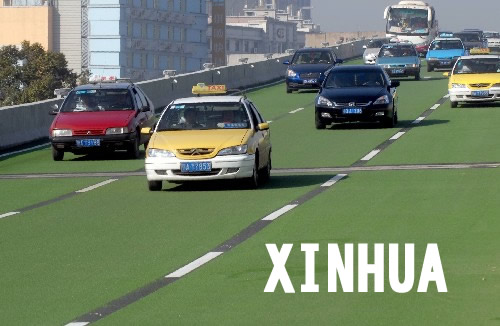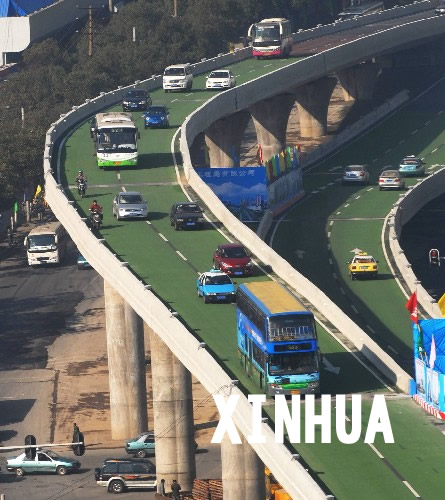 12月9日,车辆在武汉卓刀泉高架桥的绿色“跑道”上行驶。 当日,湖北省武汉市卓刀泉高架桥通车。这条高架桥为武汉市首条彩色路面高架桥,路面采用了彩色陶瓷颗粒新型材料,具有防滑、耐磨、耐腐等特点。 新华社发