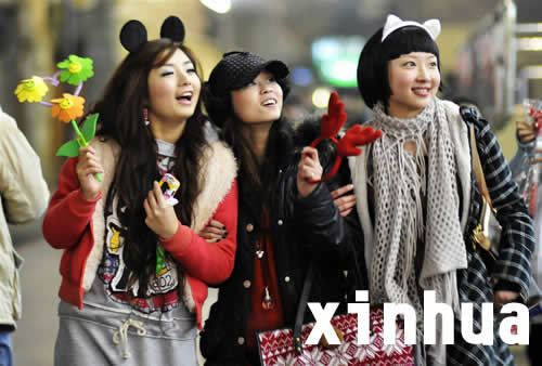 12月24日晚,在湖北省宜昌市街头,三名女孩在逛街。