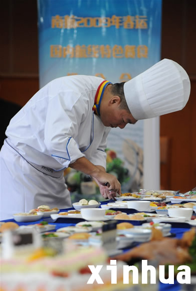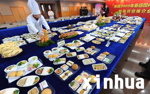 当日,南方航空公司举办“2009年春运国内航线特色餐食推介会”,展示了全国各地十几个航空食品企业的上百个各地传统特色餐食,并将根据航线地域特点选配航班节日餐食,营造浓浓“年味”。新华社记者 程敏 摄