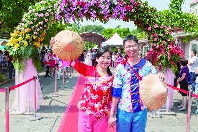 仪式上,两岸新人们的礼服各具巧思,有的着婚纱和西服,有的穿宫廷古装,苗栗新人黄绿铭、詹雅雯身穿传统客家服饰,背上竹编鱼篓,头戴竹编尖顶帽,喜气洋洋如同劳作归来。新郎黄绿铭说:“桐花婚礼与我们客家婚礼习俗融合,传承客家人吃苦耐劳精神。”