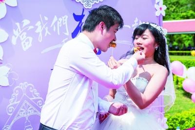 新人互喂麻薯饼,象征婚姻生活甜甜蜜蜜