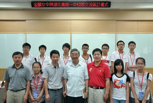 当我们步入八楼会议厅,发现台湾著名教育家、台湾“中央大学”前校长余传韬,台湾著名作家司马中原,金瓯校董、旅台湖北同乡会理事长陈兴国,中百集团驻台办事处主任佀治洪,旅台黄陂同乡会理事长陈光陆,以及金瓯女中的学生代表,济济一堂,已经在这里笑脸相迎。接着,在童校长的主持下,大家一起见证了黄陂一中与金瓯女中签订了校际交流协议书,双方交换校旗。从此,黄陂一中的校旗就飘扬在台湾校园了。