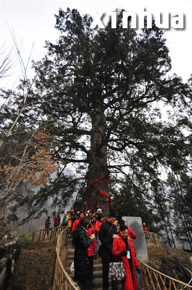 12月28日,游客在神农坛景区植物园观赏“千年古杉”。进入冬季以来,到湖北神农架旅游的客人络绎不绝。他们或到神农坛景区植物园参观珍稀植物,或在滑雪场体验滑雪乐趣,乐趣多多。 黄翔 摄