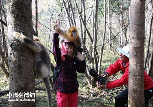 采风团成员与金丝猴互动。(神农架林区 吴太地 摄)