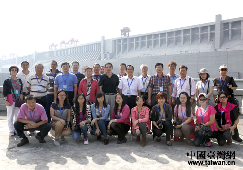 两岸新媒体在三峡大坝前合影。(图片来源:湖北省台办)