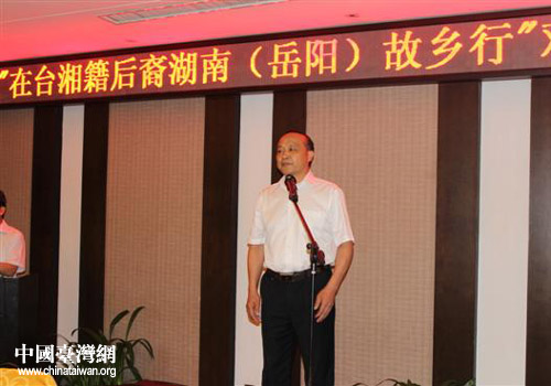 中国台湾网9月3日岳阳消息 日前,由湖南省台办主办、岳阳市台办承办“2012在台湘籍后裔湖南(岳阳)故乡行”活动在岳阳举行。来自祖国宝岛的53名湘籍后裔在台湾湘阴同乡会会长黄国晖女士的率领跨越海峡抵达岳阳。省台办副厅级纪检员蒲祖泉赴岳阳会见台湾湘籍后裔故乡行全体乡亲并在欢迎仪式上致辞。