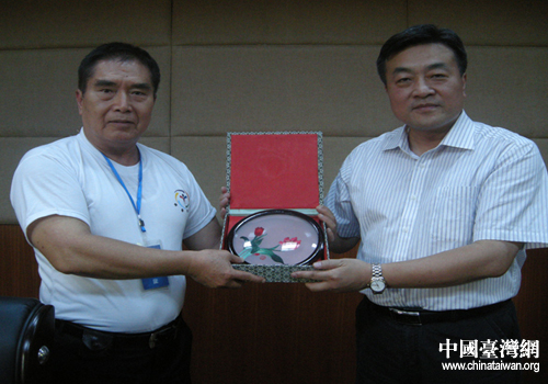 台湾领队陈蜀龙(左)和湖南文理学院党委书记李民互赠礼品。(图片来源:常德市台办)
