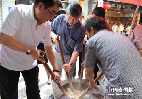 张孝威与民间小吃商一起制作民间传统美食。(图片来源:岳阳市台办)
