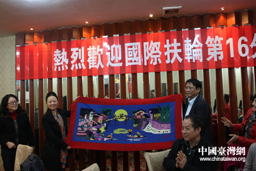 湘西州人民政府副州长向清平女士向台湾嘉宾赠送土家织锦。(图片来源:凤凰县台办)