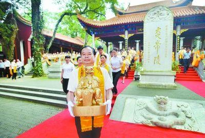 当天清晨,谒陵广场锣鼓声震天动地,龙狮劲舞虎虎生风。7时09分,起驾仪式正式开始。击鼓九通,鸣炮,奏乐,现场肃穆、庄重。随着祭祀音乐的响起,身着古装的年轻小伙抬着贡品缓步拾阶而上,将三牲五谷、时鲜贡品敬献于炎帝祀像前神案上。嘉宾们向炎帝神农氏敬献花篮,深鞠三躬,肃诚敬虔。恭读告文完毕,帛书化作袅袅青烟,告慰始祖先灵。在众人的注视和期待中,炎帝圣驾移驾至銮舆。礼炮、音乐再次响起,起驾仪式圆满告成。
