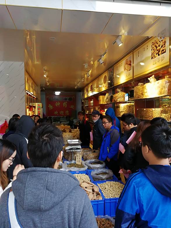 廉桥中药材市场共有经营户1200多户。同学们随机来到了一家药材店,琳琅满目的中药材引起了同学们的极大兴趣。得知同学们来自台湾,店主热情洋溢地向同学们介绍店内各种药材品种,讲述当地药材发展历史和现状,让同学们对于我国中药材、中药材市场有了更加深入的了解。
