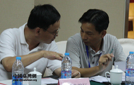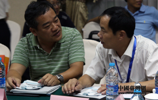 18日晚,第二届两岸乡村座谈举行两岸结对子乡村见面会,两岸30个乡村代表参加。图为结成对子的两岸乡村代表在交谈。(中国台湾网 张弛 摄)