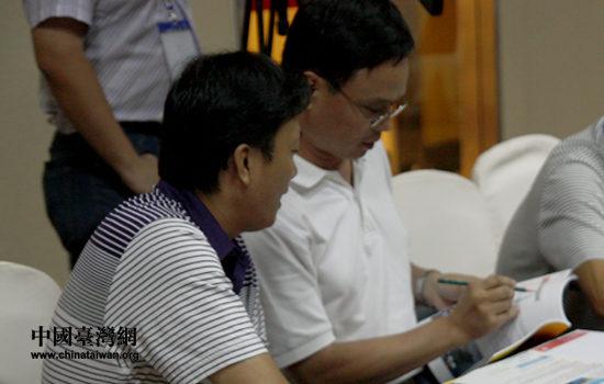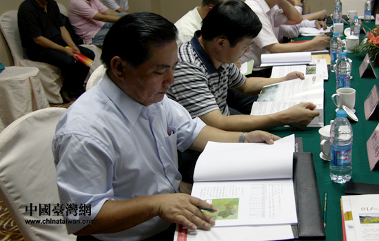 18日晚,第二届两岸乡村座谈举行两岸结对子乡村见面会,两岸30个乡村代表参加。图为参会代表在翻看结对子乡村的有关资料。(中国台湾网 张弛 摄)