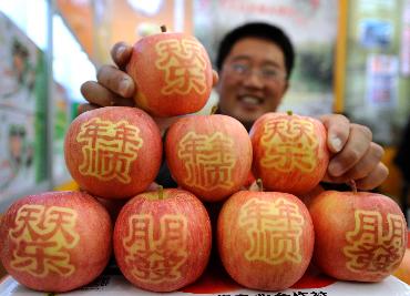 12月3日,江苏丰县喜来乐果蔬专业合作社人员在展销会上展示特色礼品苹果。