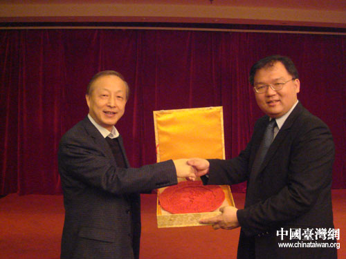 图为江苏省台办陈尧主任向参访团赠送礼品(张建美摄)