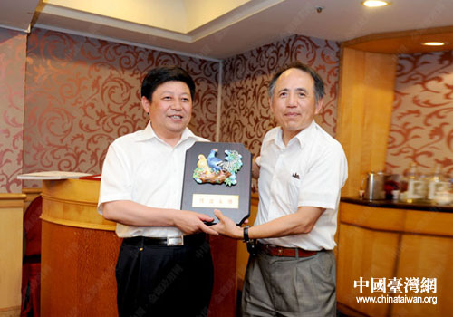 金湖县委书记肖进方与台北市工业会理事长魏昇煌互赠纪念品。(图片来源:金湖县台办)