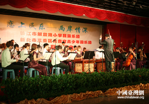 中国台湾网8月23日镇江消息 8月22日,来自台湾新北市三重区先啬宫青少年国乐团与镇江市解放路小学民族乐团在镇江市工人文化宫联合举办了一场“恋上民乐——两岸情深”海峡两岸青少年民乐交流演出。镇江市副市长曹丽虹与江苏省、镇江市有关部门领导,镇江市台属联谊会会员,应邀到镇江的常州市台商代表及镇江市解放路小学部分师生代表共300多人一同欣赏了这场精彩的演出。