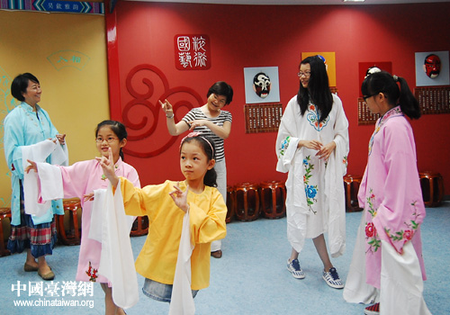 在园区青少年活动中心,访问团集中参观了活动中心的国粹馆,苏州民间文化交流中心专家钱杏珍老师为大家详细介绍了苏州的桑蚕文化。台湾中学生向艺术指导老师学习了剪纸、书法、手工纺织,还与小昆剧团学员们互动体验了昆曲表演。