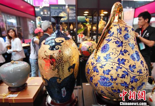 9月20日,在江苏南京举办的2012台湾名品交易会上,文创金点馆内展出的台湾雕金彩瓷格外的抢眼。中新社发 泱波 摄
