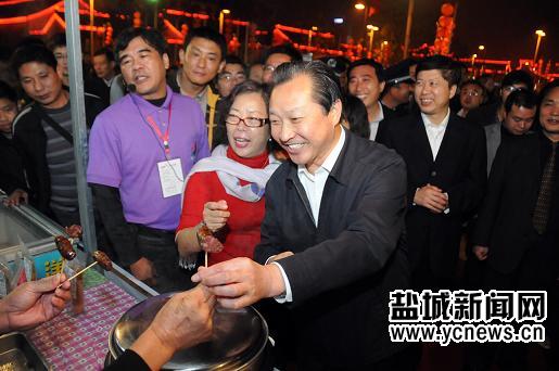 书记与市民一起品尝美食。
