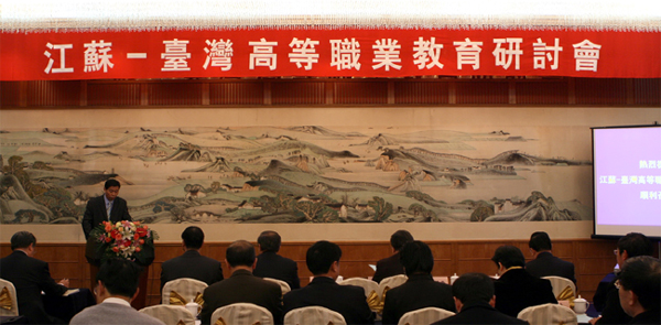 12月18日,江苏——台湾高等职业教育研讨会在南京召开,本次研讨会的主题是“加强两岸教育合作交流,共同提升教育品质和人才竞争力”,研讨会由省教育厅和省政府台湾事务办公室联合举办。省教育厅厅长王斌泰出席研讨会并作了主题报告,省政府台湾事务办公室副主任秦基春致辞,省教育厅副厅长丁晓昌主持研讨会。来自台湾的11所院校和江苏28所高职院校负责人参加了研讨会。