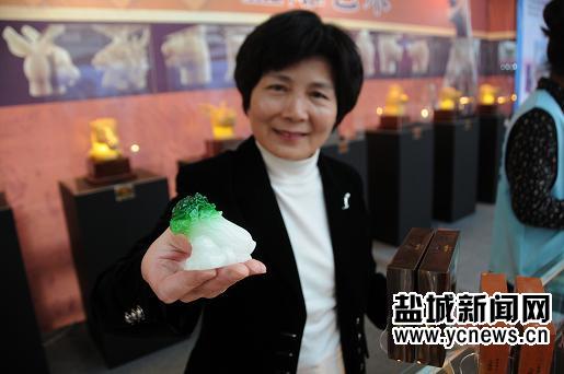 工作人员向市民展示台湾精品盐雕。