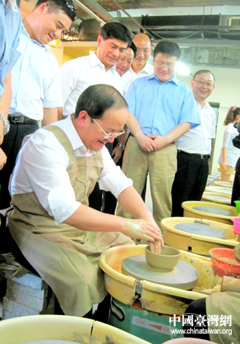 中国台湾网8月22日新北消息 8月20日下午,江西省长鹿心社、副省长洪礼和等一行,兴致勃勃的参观了新北市莺歌镇陶瓷老街。鹿心社亲身体验陶瓷拉坯工序。(中国台湾网、江西省台办联合报道)