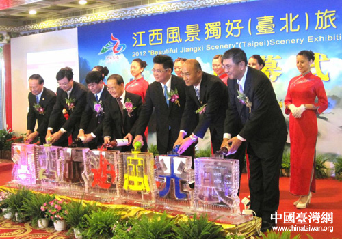 中国台湾网8月22日台北消息 8月21日,“江西风景独好(台北)旅游风光展”在台北开幕。江西省长鹿心社向10家台湾旅行社颁发了江西旅游特约合作伙伴牌匾,向台湾民众赠送了江西精品旅游景点门票,并为台湾游客赴江西旅游“包机首飞团”授旗。