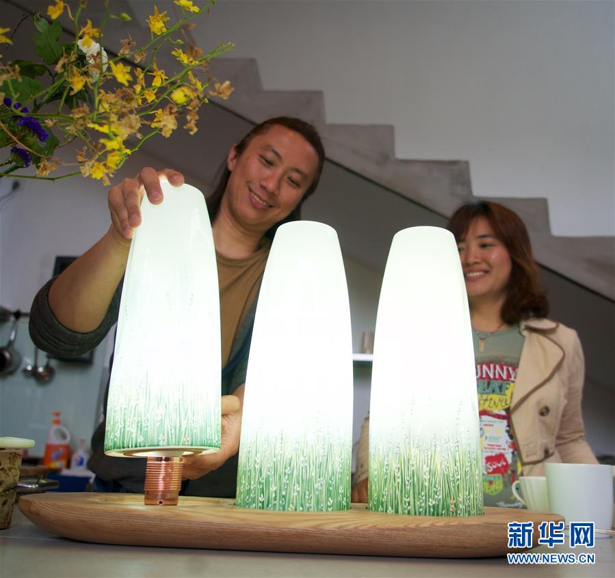 4月14日,“八月”(左)和同事罗艳检测最新生产的一批“薰衣草灯”。新华社记者 胡晨欢 摄