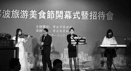 美食节开幕式上,南苑饭店餐饮部领班何丽思(右二)与台湾同行的即兴文艺表演赢得了甬台两地旅游界人士的阵阵掌声。