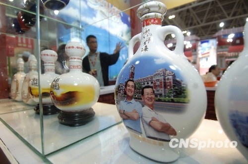 5月18日,贴有马英九、萧万长肖像的台湾白酒亮相第十二届海交会。当日,由国台办、中国贸促会、海关总署、国家质检总局和福建省政府共同主办的第十二届海峡两岸经贸交易会、第七届中国福建商品交易会在新落成的福州海峡国际会展中心开幕,近万名海内外客商赴会。 中新社发 王东明 摄