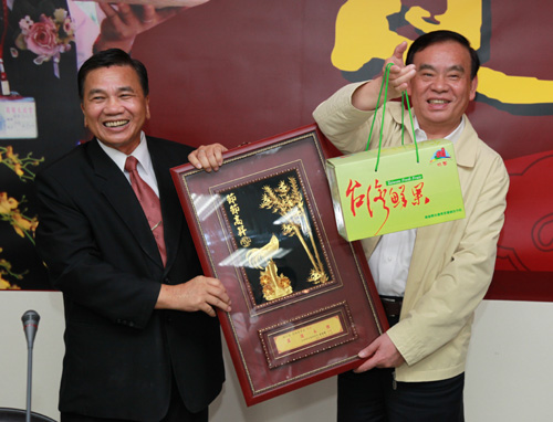 燕巢乡乡长吴德雄向吕祖善省长赠送当地水果(浙江省台办王健摄)